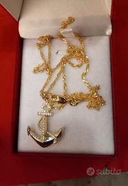 Vendo elegante catenina mai usata PLACCATA ORO18K GOLDFILLED con punzone di qualità sulla chiusura, lunghezza cm 55 con luminosa lavorazione onda d'acqua con pendente in acciaio dorato rappresentante Ancora illuminata da piccoli zirconi bianchi sintetici. Invio in scatola regalo.