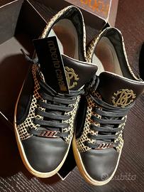 Sneakers del marchio di lusso italiano Roberto Cavalli. Il logo metallico intrecciato "RC" sulla linguetta e la stampa animalier in stile pelle di serpente sono elementi distintivi del brand.