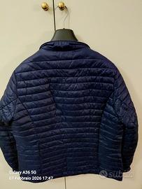 Cento grammi Blue e beige. Chiusa davanti con bottoni a scatto e cerniera Con tasche chiuse con cerniera .