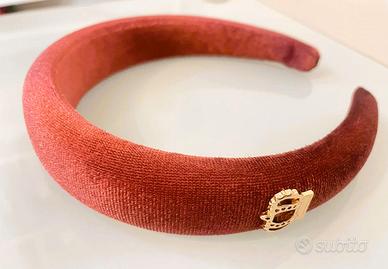 Splendido cerchietto gioiello per capelli DOLCE & GABBANA in velluto color rosa scuro-borgogna, con stemma in metallo dorato su un lato, corredato di scatola originale, nuovissimo mai indossato, taglia unica.