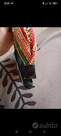 Cerchietto con nodo centrale presenta un design ricamato in stile bohémien o etnico, caratterizzato da colori vivaci come il rosso, il verde e l'oro. È un accessorio versatile, spesso associato a outfit festivi, come quelli natalizi, o a look estivi d'ispirazione messicana Nuovo mai usato ancora con cartellino