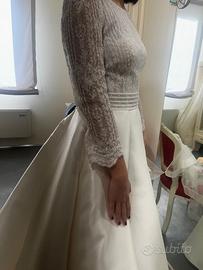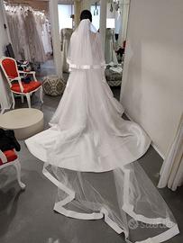 vendo abito da sposa firmato Rosa Clarà modello 2025, gonna ampia con strascico in tessuto mikado, corpetto in pizzo ricamato con perline. abito artigianale made in italy. Misura S/M. colore avorio. inclusi: - velo lungo 3 mt in tulle con bordo in raso colore avorio - Sotto gonna NUOVO mai utilizzato in tulle taglia M/L. Abito indossato solo per poche ore. Lo consegno lavato e igienizzato con il suo copri abito. Solo ritiro a mano Ferrara e provincia.