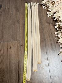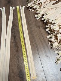 Disponibile lotto di cerniere lampo colore panna/crema, come da fotografie allegate. Cerniere con denti in materiale plastico e cursore in metallo. Dettaglio quantità: •n. 100 cerniere da 65 cm •n. 90 cerniere da 60 cm •n. 50 cerniere da 55 cm Totale: 240 pezzi Condizioni: • Vendita preferibile in lotto unico • Prezzo lotto completo: €0,20 cad. • Disponibile anche vendita frazionata in lotti personalizzati, previo accordo Vendita preferibilmente in lotto unico, ma disponibile anche la suddivisione per misure o la creazione di lotti personalizzati, eventualmente combinabili con altri articoli visibili negli annunci pubblicati. Materiale adatto a sartoria, confezione abbigliamento, borse e riparazioni. Fare riferimento alle foto per colore e stato.