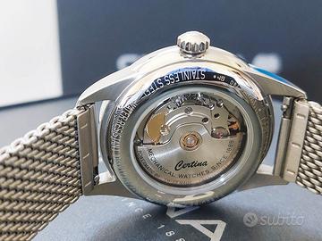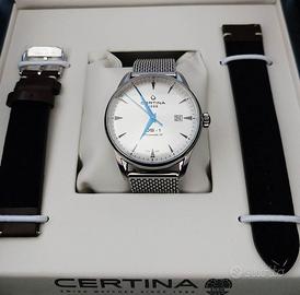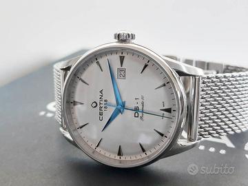Certina DS-1 Powermatic 80 Nivachron ETA 80.611 Orologio meccanico a carica automatica Powermatic 80 con spirale Nivachron antimagnetica ETA Powermatic 80.611. Cassa 40mm Acciaio Stainless Steel / Silver / Bracciale Mesh Milanese con chiusura a farfalla + secondo cinturino in pelle marrone Vetro zaffiro Impermeabile WR 100m Quadrante argento con finitura soleil e sfere di colore blu. Full set, pari al nuovo per inutilizzo (velati segni sul fondello a specchio) Trattativa diretta, per questa inserzione non desidero i metodi di transazione finale offerti da Subito, massima serietà.
