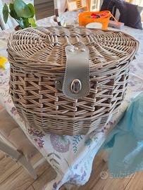 cestino pic nic per due coperti, nuovo (mai usato). composto da 2 piattimi, 2 calici, 2 forchette, 2 cucchiaini, 2 coltelli, porta sale e pepe, apribottiglie. Possiede tracolla.