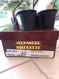 Chanel in pelle scamosciata blu con punta di vernice. Tacco 4 cm