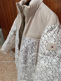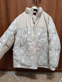 Chaqueta de invierno Tommy Hilfiger con estampado monograma icónico en blanco roto y panel superior beige. Relleno acolchado, cierre cremallera y detalle bandera TH. Estado: segunda mano en buen estado. Talla visible en etiqueta.