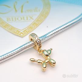 Bellissimo charm per bracciale Pandora composto da un anello decorato con zirconi che si infila nel bracciale, a cui è agganciato un ciondolo a forma di cagnolino cane barboncino fatto con i pallonciny come nei party. Lo charm è tutto dorato gold.