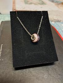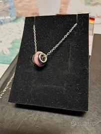 Charm in vetro di Murano prodotto artigianalmente con combinazione di colori rosa e nero dove nascono le striature lilla e viola.
