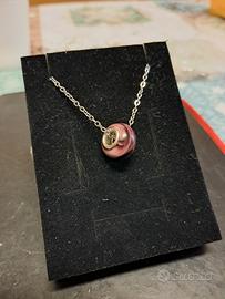 Charm in vetro di Murano prodotto artigianalmente con combinazione di colori rosa e nero dove nascono le striature lilla e viola.