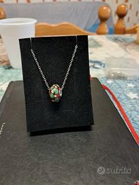 Charm in vetro di Murano prodotto artigianalmente con combinazione di colore principale Borgogna e colori verde e bianco in decorazioni .