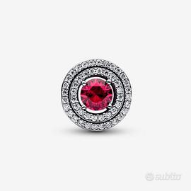 Aggiungi un tocco di colore ai tuoi gioielli con questo charm Pavè e Pietra Rossa in Argento Sterling originale 925.Ogni lato del charm presenta un cristallo rotondo creato dall’uomo taglio brillante, circondato da due file di pietre di zirconia cubica incolore incastonate a granette. Infine, un motivo con cuori intagliati decora i lati. Indossa il charm sul tuo bracciale Pandora Moments preferito per un look scintillante.