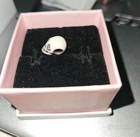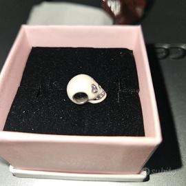 Il charm in Argento Sterling 925 presenta un teschio dipinto con smalto bianco che si illumina al buio, con bocca e occhi a forma di cuore scintillanti e pietre di zirconia cubica incolori. Intagli ornano i lati della bocca, il naso e la parte inferiore del teschio.
