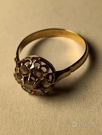 Un delizioso chevalier a rosetta in oro 750 (18 Kt), marchiato all’interno, ideale sia per signora che per uomo. Una rosetta dal design retrò, realizzata negli anni 50, con brillanti che la rendono piacevole da indossare e molto agevole. Diametro interno: 1,7 cm Si spedisce unicamente con assicurata.