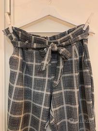 Trendy pantaloni a quadretti bianchi e neri, con taglio a vita alta nello stile paperbag. Presentano una cintura da annodare in vita, valorizzando una silhouette femminile ed elegante. Molto versatili e comodi, ideali per look casual o per occasioni più formali. In condizioni eccellenti—pronti a dare un tocco in più al tuo guardaroba!