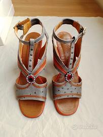 CHIE MIHARA sandali n.37 in vera pelle multicolore, tacco cm 8, con cinturino regolabile alla caviglia con elastico posteriore, chiusura con fibbia ed elementi decorativi (bordo smerlato, borchie e pietra gioiello rosso magenta centrali), Made in Spain, tomaia, fodera e sottopiede in vera pelle, suola in vero cuoio e gomma antiscivolo.
