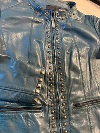 Bellissimo chiodo colore azzurro polvere Marca Bomboogie in vera pelle taglia 42 donna con borchie diamantate sui polsi e sulla cerniera. Taschino interno.