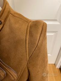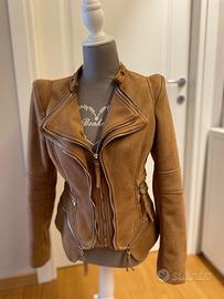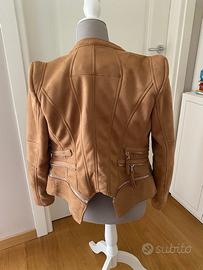 Chiodo con cerniera sciancrato, vestibilità asciutta. Taglia L (ma vestibilità 42/44); spalline imbottite. Interamente foderato