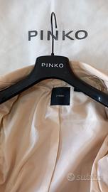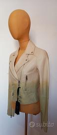 Giacca in pelle stile Chiodo modello Sensibile di #Pinko, colore beige con sfumatura, dotato di bottoni metallici sul collo, tasche con zip metallica, alamari con bottoni a fondo capo e maniche con zip e alamaro al fondo. Presenta una chiusura con zip asimmetrica.