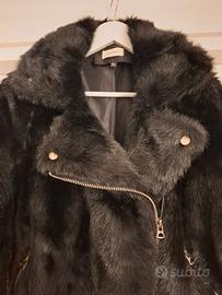 Chiodo nero in pelliccia sintetica di qualità, lucida e morbida. Foderato. Vestibilità M, poco sotto la vita