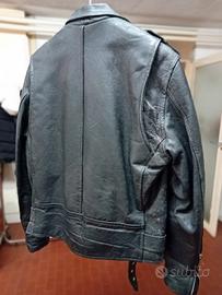 Chiodo vintage in pelle nera. Taglia 44. Presenta molti segni di usura, la pelle in alcuni punti ha delle macchie bianche, sicuramente da pulire.