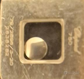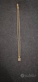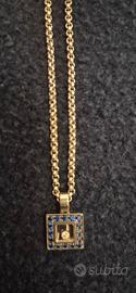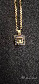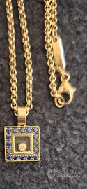 ciondolo chopard ,collana della collezione( happy diamonds). Il design è caratterizzato da un diamante mobile "danzante" racchiuso tra due vetri zaffiro, circondato da una cornice quadrata.di 16 zaffiri blu come da foto. Collezione:Happy Diamonds (spesso identificato come modello "Icon" o numero di riferimento79/2896). Materiali:Realizzato inoro bianco 18 carati(750/1000). Pietre Preziose: Un diamante centrale mobile. Una cornice esterna incastonata conzaffiri blua taglio rotondo. Esistono varianti simili con diamanti o altre pietre nella cornice. collana 42 cm .