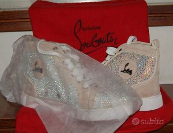 La vendita è relativa a un paio di sneakers 100% originali Christian Louboutin modello "Louis" camoscio beige rosato tempestate di cristalli swarovski nuove mai indossate il cui prezzo al pubblico è di 1.750,00 euro. Vengono vendute complete di sacchetto proteggi cristalli e sacchetti antipolvere uno per ciascuna scarpa. Size 38
