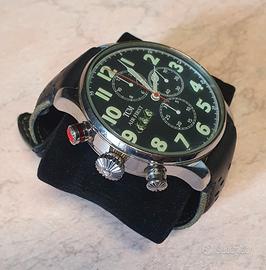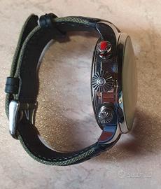Vendo Chrono Mancino ETA 7750. Cassa in acciaio lucido di 47 millimetri, vetro bombato. Quadrante nero con i “Tre Sorci Verdi” luminosi come le cifre arabe. Fondello con incisione in a rilievo che raffigura “I Sorci Verdi”. Lancetta dei secondi crono grafici e pulsante rese t di colore rosso. Consegna a mano in Alessandria o spedisco io dopo pagamento