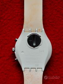Vendo cronografo Swatch bianco denominato "White Horse" modello scw 100 da collezione. Orologio nuovo mai indossato. Cinturino in silicone bianco lievemente macchiato dal tempo visto che è del 1990, però credo che si riesca a pulire. Scatola in plastica e foglio non presenti. Oggetto nuovo aperto solo per esposizione. Per qualsiasi informazione contattatemi. Spedizioni a carico acquirente.