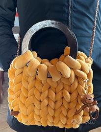 Borsa artigianale con filto marshmallow intrecciata a mano con manici in legno