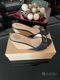 Ciabatta Laura Biagiotti alta con tacco in sughero e aperta. Condizioni pari al nuovo. Numero 37. Completa di scatola originale