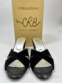 Originale ciabatta da casa in camoscio finissimo colore nero. Fasce incrociate, fodera vera pelle, suola in camoscio vera pelle. Tacco a zeppa ricoperto in camoscio cm.7. Lunghezza cm. 21,5.