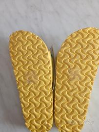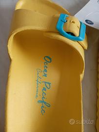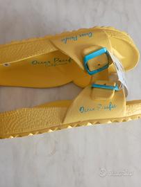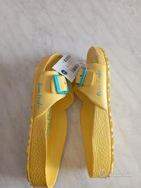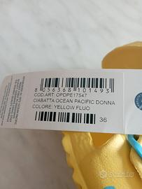 Vendo ciabatte nuove ancora con etichetta,di colore giallo acceso e accessorio turchese,si possono regolare tramite la fibbia in materiale plastico. Numero 36.