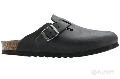 Zoccoli Birkenstock. Colore nero. Modello Boston. Parte superiore in pelle cerata. Fibbia laterale regolabile. Suola in EVA. Soletta anatomica in gomma. ACQUISTATI PER MIA MOGLIE PURTROPPO HO SBAGLIATO IL NUMERO E NON HO PIU LA SCATOLA PER CAMBIARLE. PERFETTE ANCORA SOTTO SUOLA PERFETTO MAI USATE.