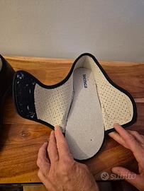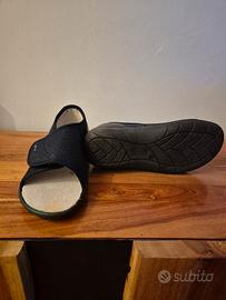 Ciabatte acquistate in ortopedia per piedi problematici (alluce valgo, dita accavallate, post-operatorio). La tomaia in tessuto morbido si apre completamente e col velcro si può chiudere adattandosi al piede. La soletta si può estrarre. Usate poco, sono in ottimo stato.