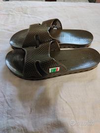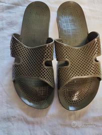 Vendo ciabatte da doccia tipiche della vestizione esercito italiano. Il numero è il 40-41. Per chi conosce la peculiarità e la “qualità” di questo articolo, sa che probabilmente sono piu indicate al “collezionismo” che alluso vero e proprio. Un articolo originale e simpatico, ancora nella confezione originale.