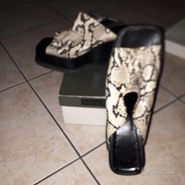 VENDO CIABATTE DA DONNA IN VERA PELLE DI PITONE CON PLATEAU ALTO COLORE NERO, CON FASCIA IN PELLE NUMERO 39. ELABORATE ARTIGIANALMENTE,USATE 2/3 VOLTE .CONDIZIONE DELLARTICOLO BUONO