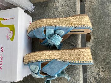 Ciabatte azzurre con parte inferiore in corda superiore in tessuto tipo camoscio. Indossate una sola volta , quindi quasi nuove