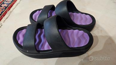 Design & Colore: Presentano una tomaia in gomma nera con una soletta interna lilla a onda super confortevole e due cinturini a fascia.