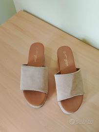 Vendo ciabatte / zoccoli. Parte superiore effetto camoscio. Con base decorata in corda e strass con zeppa da 7 cm, colore beige. Indossate una sola volta, vendo per inutilizzo. Numero 39 #zoccoli #sabot #Tatoo #ciabatte #ciabatta #ciabattadonna #ciabattaaperta #ciabattaestiva #tatoo