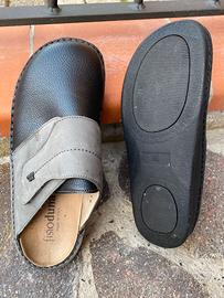 Ciabatte sanitarie chiuse per uomo taglia 44 in pelle nera con inserti di camoscio colore grigio con strappo alto regolabile, con plantare anatomico e suola in gomma antiscivolo, adatta anche al piede diabetico perché senza cuciture all’interno, usate poco, marca Fisioduna (made in Italy).