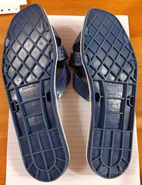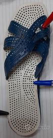 Vendo di seconda mano in buono stato ciabatte originali degli anni 70, SENSI& C, assisi, made in italy, color blue, n° 40/41. La ciabatta sx presenta dei piccoli difetti evidenziati da punte penna (foto2) EURO 15,00