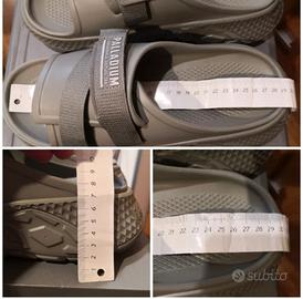 Ciabatte uomo Palladium tg. 44 nuove al 100%, mai usate, mai indossate, con cartellino attaccato, con scatola originale, totalmente in gomma EVA grigia morbida, con suola ammortizzata e cinghia in tessuto per la regolazione della fascia tramite velcro.