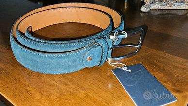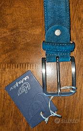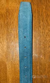 Cinta da uomo Byblos. Pelle scamosciata azzurra; misura 125-110 cm. Mai indossata, nuova con cartellino.