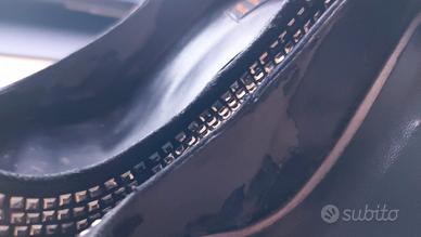 Vendo scarpe alte con tacco (14cm) numero 40 Cinti edizione Marzo 2022. Il materiale è camoscio con fantasia di diamanti a mosaico e plateau. Le scarpe esteticamente si presentano perfettamente integre e poco usate, ma nella parte interna è presente un vistoso logorio della pelle che tende a sgranarsi come è visibile in foto.