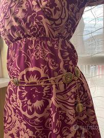 La cintura presenta una spessa catena color oro intervallata da grandi medaglioni circolari.