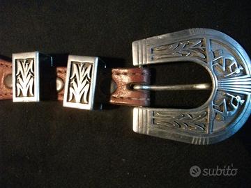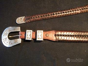 "Cintura americana da uomo della tribù Navajo" anni 90 - cintura in cuoio lunga 106 cm con fibbia e passanti in argento - fibbia con Kokopelli in argento sterling Navajo dei nativi americani - fibbia dall'attacco alla gobba lunga 6 cm e la parte più panciuta 6 cm larga