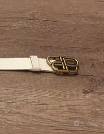 Cintura Balenciaga in pelle bianca e logo dorato. Unisex. Presenta qualche segno di usura.