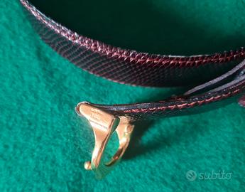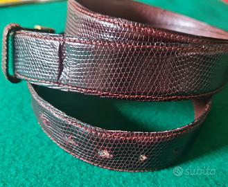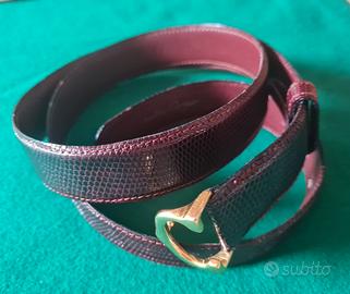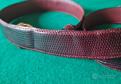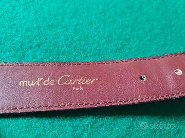 Cintura per uomo o donna in lucertola di Must di Cartier di colore bordeaux con fibbia a C finitura oro. La cintura misura 107 cm di lunghezza e 3 cm di larghezza. Le condizioni sono discrete poichè sono visibili i segni dell'uso.