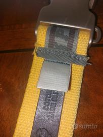 Presenta una fibbia a scatto con il logo D&G inciso e la scritta ripetuta "CLUB SHOCK POP" lungo la lunghezza della cintura, stile Industrial
